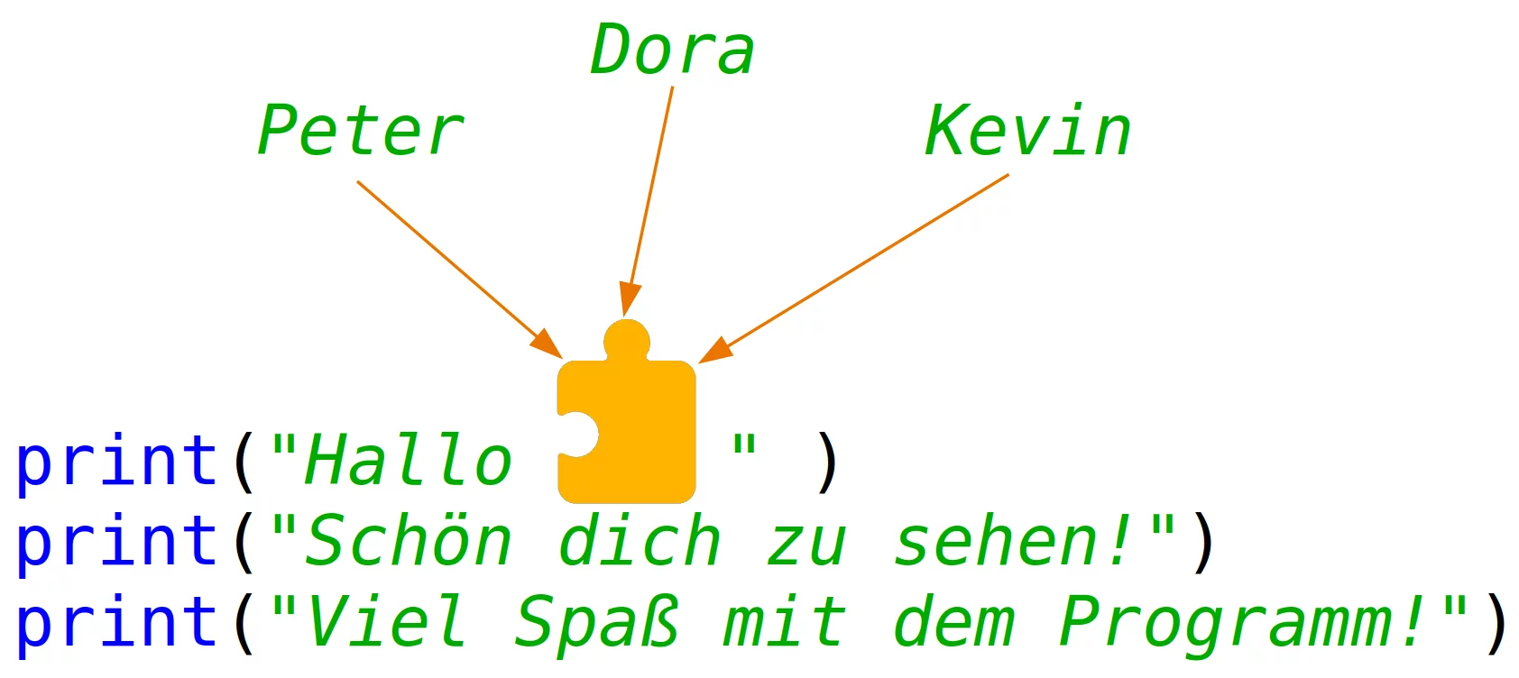 Wir können im Code sehen, dass wir drei Personen begrüßen. Jedes Mal verwenden wir drei print-Aufrufe, die nahezu gleich sind. Nur der Name ist anders. Dies nennen wir redundanten Code. Wir wiederholen den Code dreimal. Das sollte natürlich nicht sein. Dies ist der Punkt, an dem Funktionen in Python verwendet werden können und sollten. Wir könnten im Code statt der Namen einen Platzhalter verwenden. Im folgenden ein Puzzleteil. Wir schreiben den Code nur noch einmal und ersetzen jeweils das Puzzleteil mit Namen: