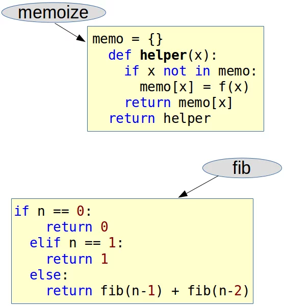 Nach dem Ausführen der Zeile fib = memoize(fib) zeigt fib auf den Body der Helper-Funktion, der nach dem Aufruf memoize(fib) zurückgeliefert wird. Wir können außerdem erkennen, dass der Code der ursprünglichen Fib-Funktion nur noch durch f in der Helper-Funktion aufgerufen wird bzw. aufgerufen werden kann. Es gibt sonst keine Referenz mehr auf die ursprüngliche fib-Funktion. Im return-Statement return fib(n-1) + fib(n-2) wird nun die neue, dekorierte Fibonacci-Funktion aufgerufen, d.h. die von memoize zurückgelieferte helper-Funktion: