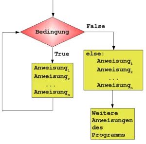 Die Anweisungen im else-Teil werden ausgeführt, sobald die Bedingung nicht mehr erfüllt ist. Sicherlich fragen sich einige nun, worin dann der Unterschied zu einer normalen while-Schleife liegt. Hätte man die Anweisungen nicht in den else-Teil gesteckt sondern einfach hinter die while-Schleife gestellt, wären sie ja auch genauso ausgeführt worden. Es wird erst mit einem break-Kommando, was wir später kennenlernen sinnvoll. Allgemein sieht eine while-Schleife mit else-Teil in Python wie folgt aus: