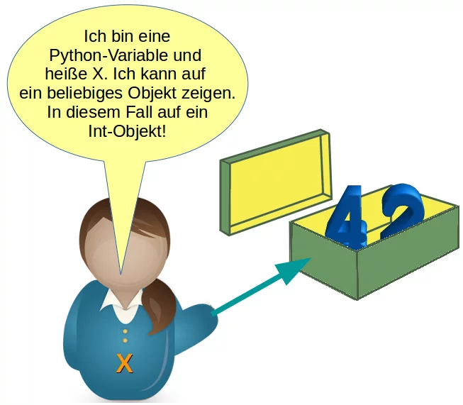 Wir wollen einen genaueren Blick auf die Implementierung von Variablen in Python werfen. Variablen referenzieren Objekte in Python. Die eigentlichen Daten sind jedoch im Objekt enthalten.